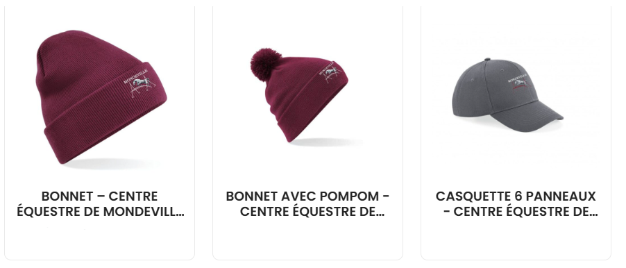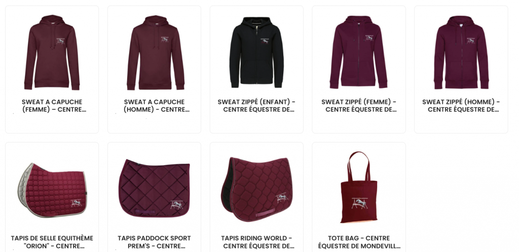 Votre club vous propose de retrouver différentes vestes, tee-shirts, bonnets, casquettes, accessoires ainsi que des tapis à l’effigie de votre centre équestre.